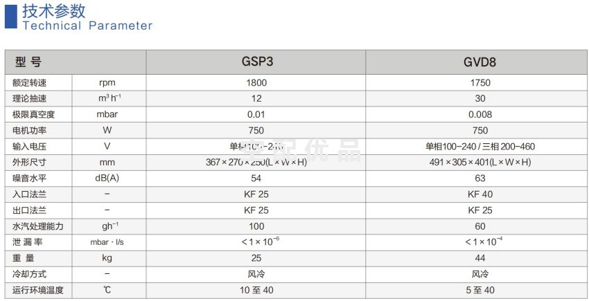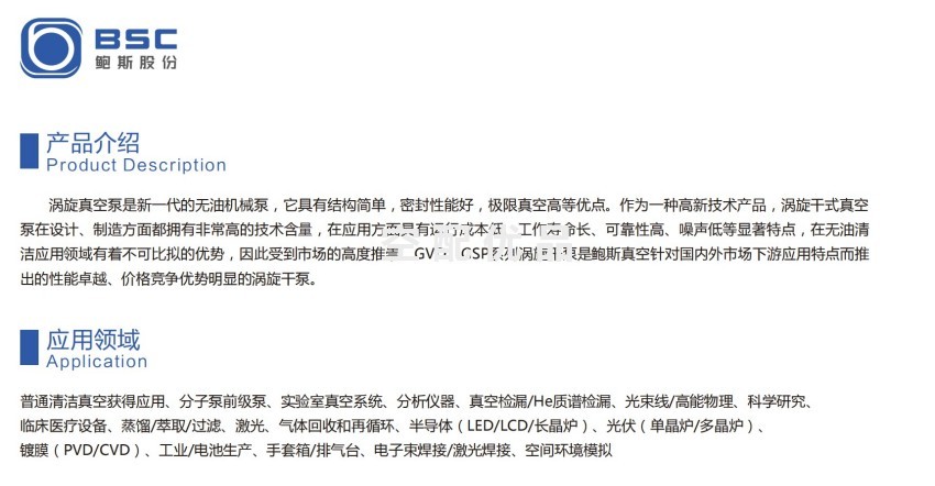 涡旋真空泵是新一代的无油机械泵,它具有结构简单,密封性能好,极限真空高等优点。作为一种高新技术产品,涡旋干式真空 泵在设计、制造方面都拥有非常高的技术含量,在应用方面具有运行成本低、工作寿命长、可靠性高、噪声低等显著特点,在无油清 洁应用领域有着不可比拟的优势,因此受到市场的高度推崇。 GVD、GSP系列涡旋干泵是鲍斯真空针对国内外市场下游应用特点而推 出的性能卓越、价格竞争优势明显的涡旋干泵。